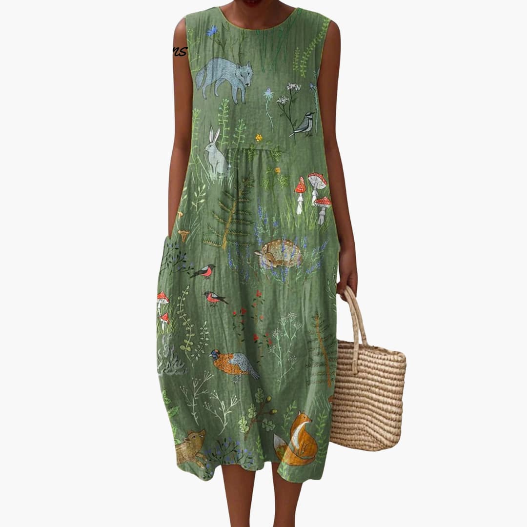 Women’s sleeveless midi dress with forest print and pockets