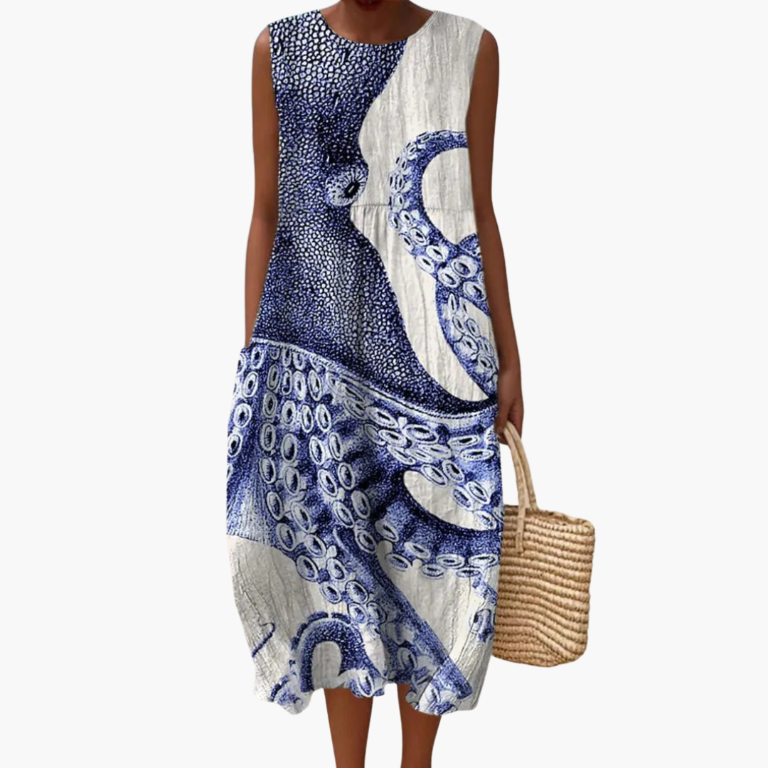Women’s sleeveless midi dress with octopus print and tie-back