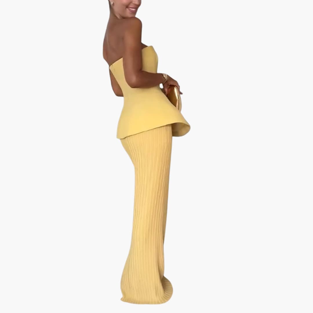 Women’s strapless maxi dress with pleated skirt and peplum bodice