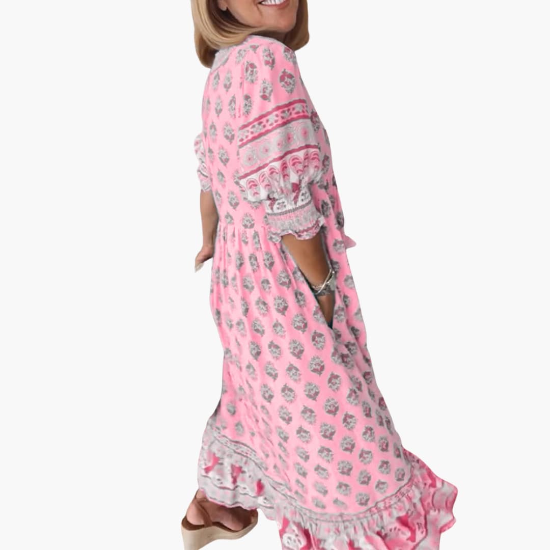 This women’s summer dress is made from lightweight breathable fabric, suitable for warm-weather use. It features a V-neckline, half sleeves, and a relaxed fit. The flowy silhouette extends to a midi-to-long length with an all-over printed design. Appropriate for daily wear in casual or semi-formal settings.